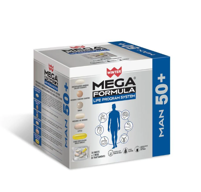 Agenti stabilizzanti: fosfato di calcio, cellulosa microcristallina, maltodestrina; Serenoa (Serenoa repens W. Bartram Small) frutto e.s. tit. 45% in acidi grassi totali; Epilobio (Epilobium angustifolium L.) foglia e.s. 4:1; Pomodoro (Solanum licopersycum L.) frutto e.s. tit. 6% in licopene; Zucca (Cucurbita pepo L. var. oleifera Pietsch) seme e.s. tit. 40% in acidi grassi e 0,075% in fitosteroli; Melograno (Punica granatum L.) frutto e.s. tit. 40% in ac. ellagico; Bromelina rivestita 5000 GDU/g da Ananas (Ananas comosus L. Merr.) stipite e.s.; Agente anti-agglomerante: biossido di silicio. Agenti stabilizzanti: fosfato di calcio, cellulosa microcristallina; Bacopa (Bacopa monnieri L. Pennell) erba e.s. tit. 20% in bacosidi; Hericium (Hericium erinaceus Bull. Pers.) sporoforo e.s. tit. 30% in polisaccaridi; Agenti anti-agglomeranti: biossido di silicio, magnesio stearato. Olio di PESCE (EPA/DHA 60%/15%); Involucro: gelatina alimentare; Agente di resistenza: glicerolo. Agenti stabilizzanti: fosfato di calcio, cellulosa microcristallina; Tribulus (Tribulus terrestris L.) frutto e.s. tit. 40% in saponine; Guaranà (Paullinia cupana Kunth) seme e.s. tit. 2,5% in caffeina; Tè verde (Camellia sinensis L. Kuntze) foglia e.s. tit. 98% in polifenoli, 70% in catechine (EGCG ≤ 45%); Agenti anti-agglomeranti: biossido di silicio, magnesio stearato “”Carbonato di magnesio; Sali di calcio dell’acido ortofosforico; Vitamina C (acido L-ascorbico); Agenti anti-agglomeranti: mono-digliceridi degli acidi grassi, PVP, biossido di silicio; Vitamina E (acetato di DL-alfa-tocoferile); Tagete (Tagetes erecta L.) capitula polvere tit. 20% in luteina; Niacina (nicotinamide); Fumarato ferroso; Acido pantotenico (D-pantotenato, calcio); Poligonum (Polygonum cuspidatum Siebold & Zucc.) radice e.s. tit. 98% in resveratrolo; Coenzima Q10; Tagete (Tagetes erecta L.) capitula polvere tit. 10% in zeaxantina; Vitamina B12 (cianocobalamina); Gluconato di rame; Solfato di manganese; Borato di sodio; Vitamina A (acetato di retinile); Vitamina K2 (trans menachinone-7); Vitamina B6 (cloridrato di piridossina); Vitamina B2 (riboflavina); Vitamina D (colecalciferolo); Vitamina B1 (cloridrato di tiamina); Picolinato di cromo; Acido folico (acido pteroil-monoglutammico). Cheratina; Agenti stabilizzanti: fosfato di calcio, cellulosa microcristallina; Agenti anti-agglomeranti: polivinilpirrolidone, gliceril-dibeenato, magnesio stearato, biossido di silicio; Miglio (Panicum miliaceum L.) frutto e.s.; Ortica (Urtica dioica L.) foglie e.s. tit. 1% in silice; Equiseto (Equisetum arvense L.) erba e.s. tit. 7% in silice; L-Cistina; L-Metionina; Ossido di zinco; D-biotina; Agenti di rivestimento: HPMC, PEG.